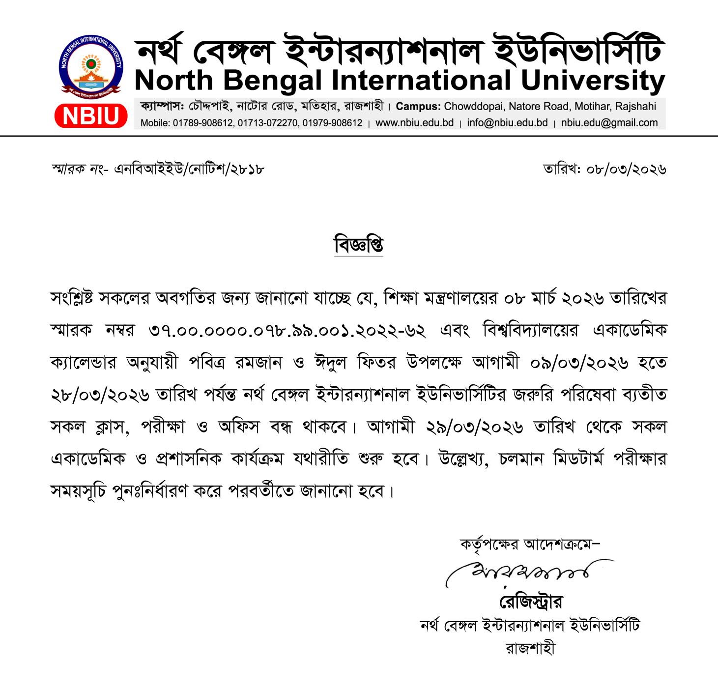 North Bengal International University (Bengali: নর্থ বেঙ্গল ইন্টারন্যাশনাল ইউনিভার্সিটি), a beacon of educational excellence was established on 15 September, 2013 with the approval and endorsement of the Government of the Peoples Republic of Bangladesh and UGC (University Grants Commission). Our university, guided by a vision of academic prowess and social advancement, is proud to host a diverse community of students, faculty, and staff from around the globe.