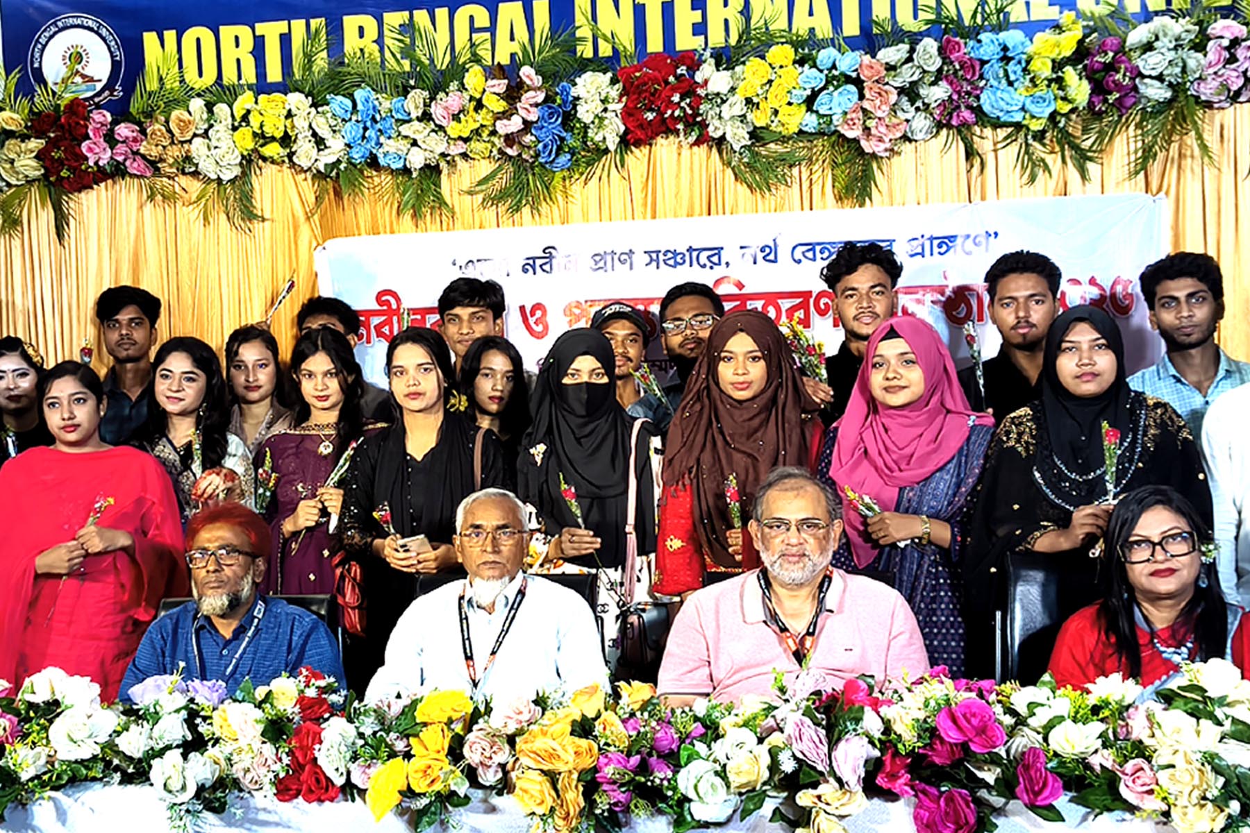 (প্রেস বিজ্ঞপ্তি, ২৩ অক্টোবর ২০২৫): নর্থ বেঙ্গল ইন্টারন্যাশনাল ইউনিভার্সিটি-তে (এনবিআইইউ) স্প্রিং ও অটাম -২০২৫ সেমিস্টারের নবীন শিক্ষার্থীদের বরণ করে নেওয়া হয়েছে। একই সাথে মেধাবী শিক্ষার্থীদের মেধা পুরস্কার, ইনডোর গেমস ও রচনা প্রতিযোগিতার পুরস্কার প্রদান করা হয়েছে। বৃহস্পতিবার সকাল ১০টায় রাজশাহী মহানগরীর চৌদ্দপাই-এ ইউনিভার্সিটির কনফারেন্স রুমে এ অনুষ্ঠানের আয়োজন করা হয়। অনুষ্ঠানে সভাপতিত্ব করেন ইউনিভার্সিটির ভারপ্রাপ্ত উপাচার্য প্রফেসর মো আনসার উদ্দিন। বিশেষ অতিথি হিসেবে উপস্থিত ছিলেন ইউনিভার্সিটির নির্বাহী পরিচালক রিয়াজ মোহাম্মদ, রেজিস্ট্রার ড. আজিবার রহমান, সামাজিক বিজ্ঞান অনুষদের ডিন প্রফেসর ড. মকসুদুর রহমান, ইভেন্ট ম্যানেজমেন্ট কমিটির সভাপতি ড. নাসরিন লুবনা। শিক্ষার্থীদের সঞ্চালনায় অনুষ্ঠানে সকল বিভাগের শিক্ষক-শিক্ষার্থী, কর্মকর্তা ও কর্মচারীবৃন্দ উপস্থিত ছিলেন। অনুষ্ঠানের দ্বিতীয় পর্বে শিক্ষার্থীদের পরিবেশনায় মনোঙ্গ সাংস্কৃতিক অনুষ্ঠানের আয়োজন করা হয়।
