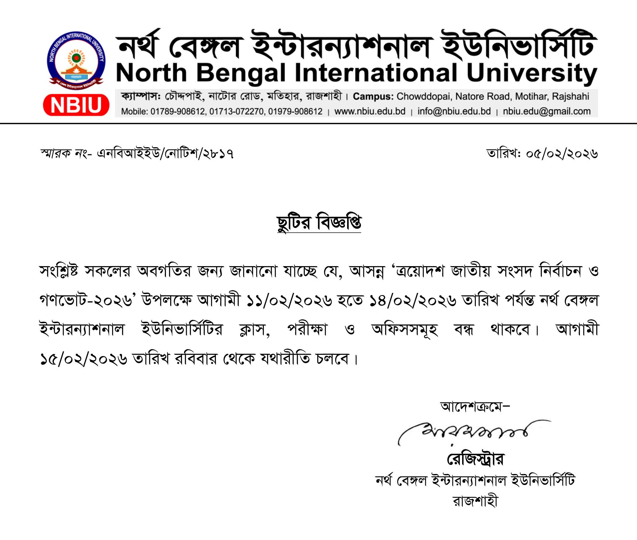 Join us as we embark on a journey of discovery, innovation, and collaboration. Whether you're a prospective student, a dedicated faculty member, or a passionate researcher, we welcome you to be a part of our vibrant academic community at North Bengal International University.